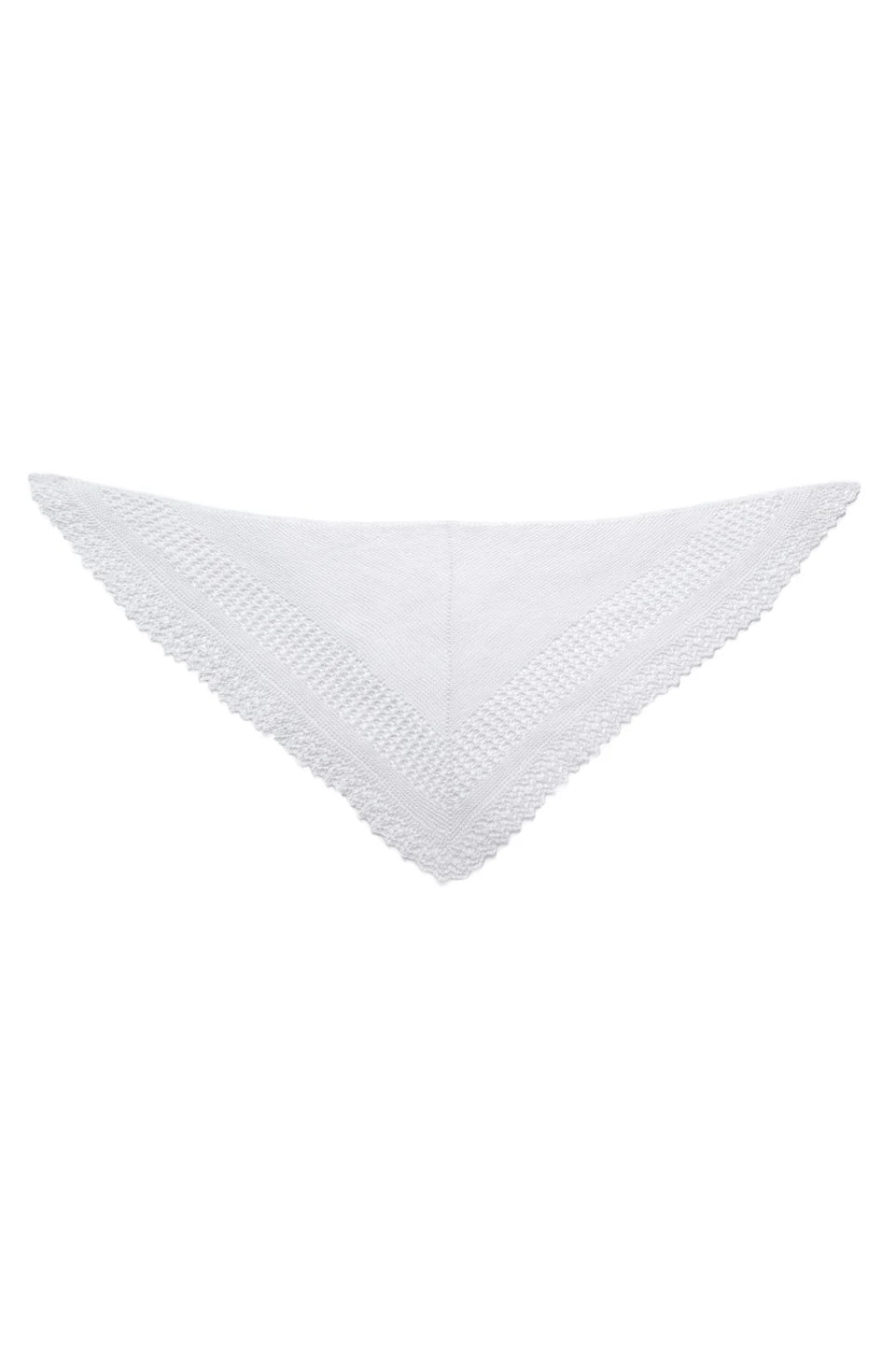 This lace triangle is worked from the outside in, starting with the lace edging which is worked side-to-side with a yarn over selvedge. After the lace edging is completed, stitches for the main section of the triangle are picked up from the yarn over selvedge. The remainder of the piece is worked from the bottom up and shaped with decreases until only a few stitches remain at the top center of the triangle. To finish, these remaining stitches are grafted together.