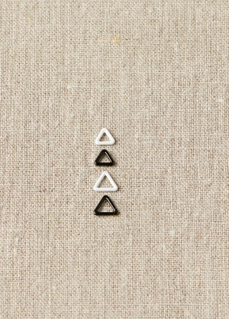 Our new Triangle Stitch Markers are designed with an angled shape to stand out from your knitting. They slide easily along your needle, and the bold black & white colors are visible against any yarn color.