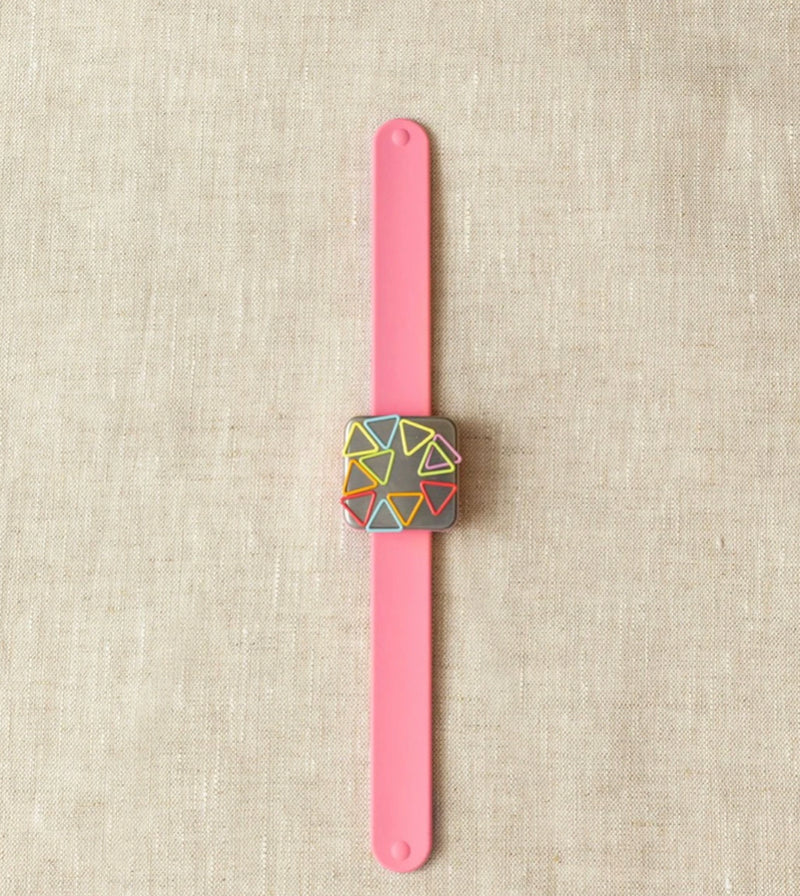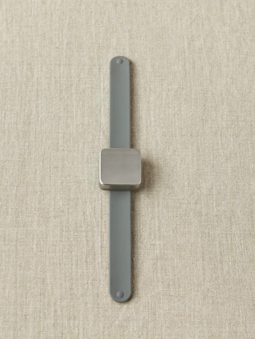 Magnetic tool holder for your wrist with handy markings in inches and centimeters to measure your swatches! Keeps all of your notions in one place while you are crafting.