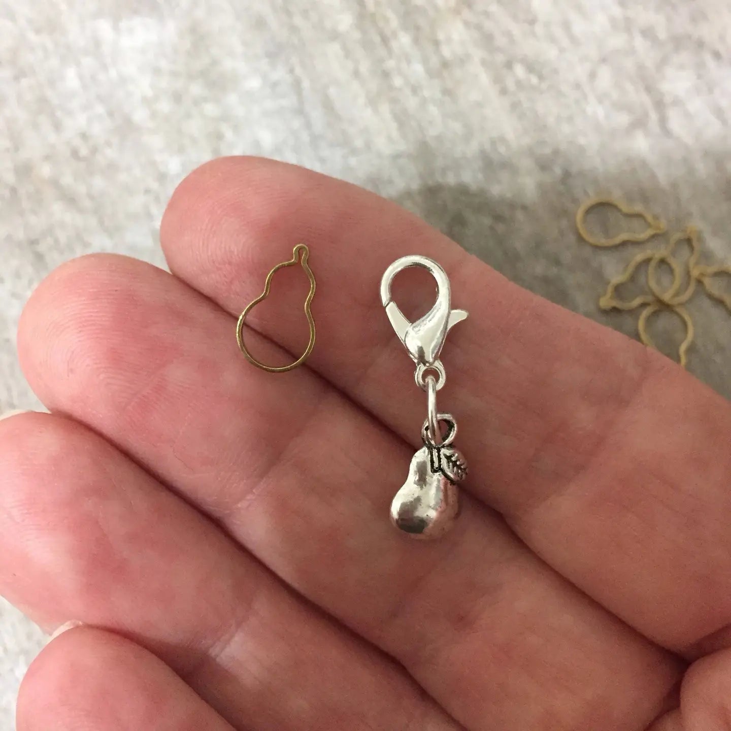 10 x 6 mm tiny raw brass lightweight pear shaped stitch markers and one silver toned pear progress keeper.