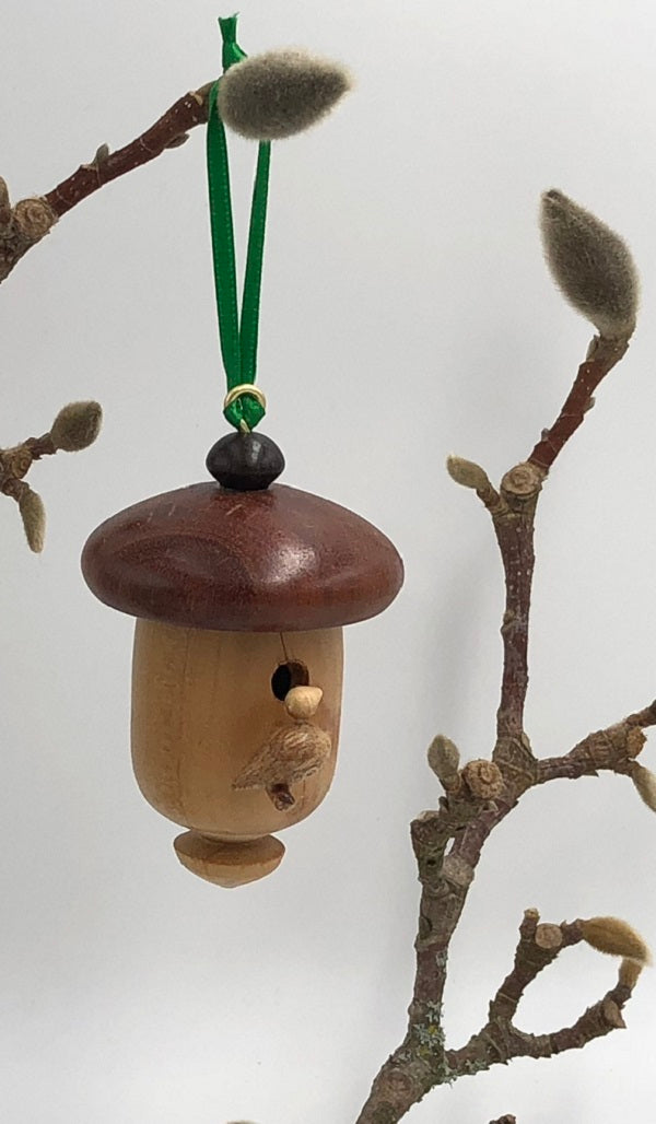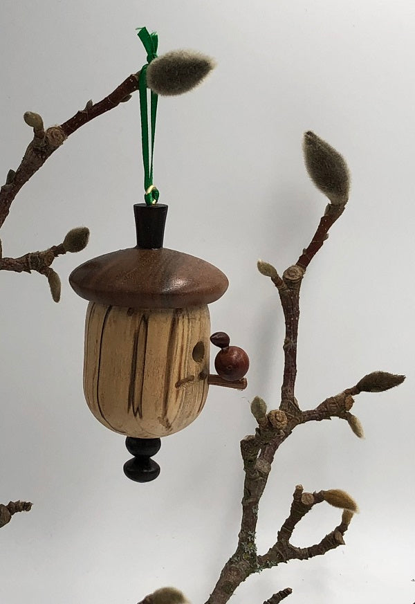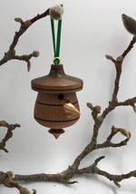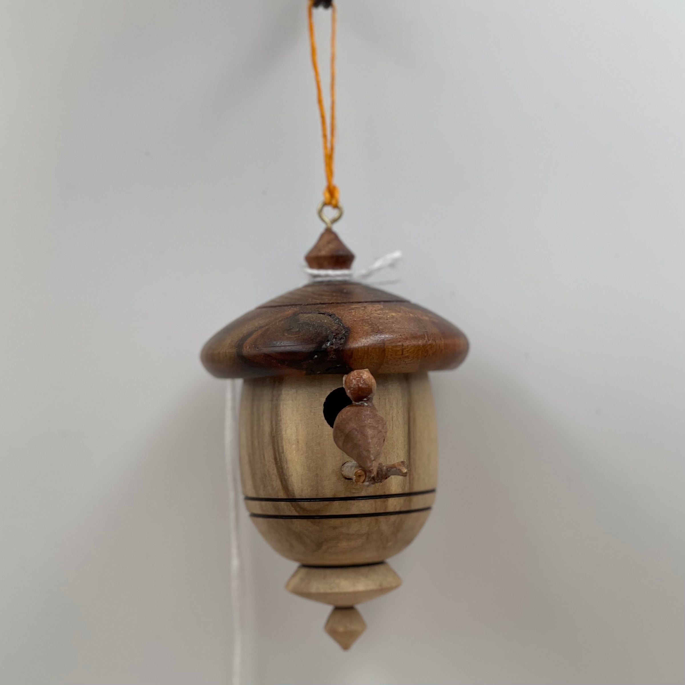Quirky and beautiful hand turned wood birdhouse ornaments. Made by local artisan David Earls using found woods in his Pinole CA studio.