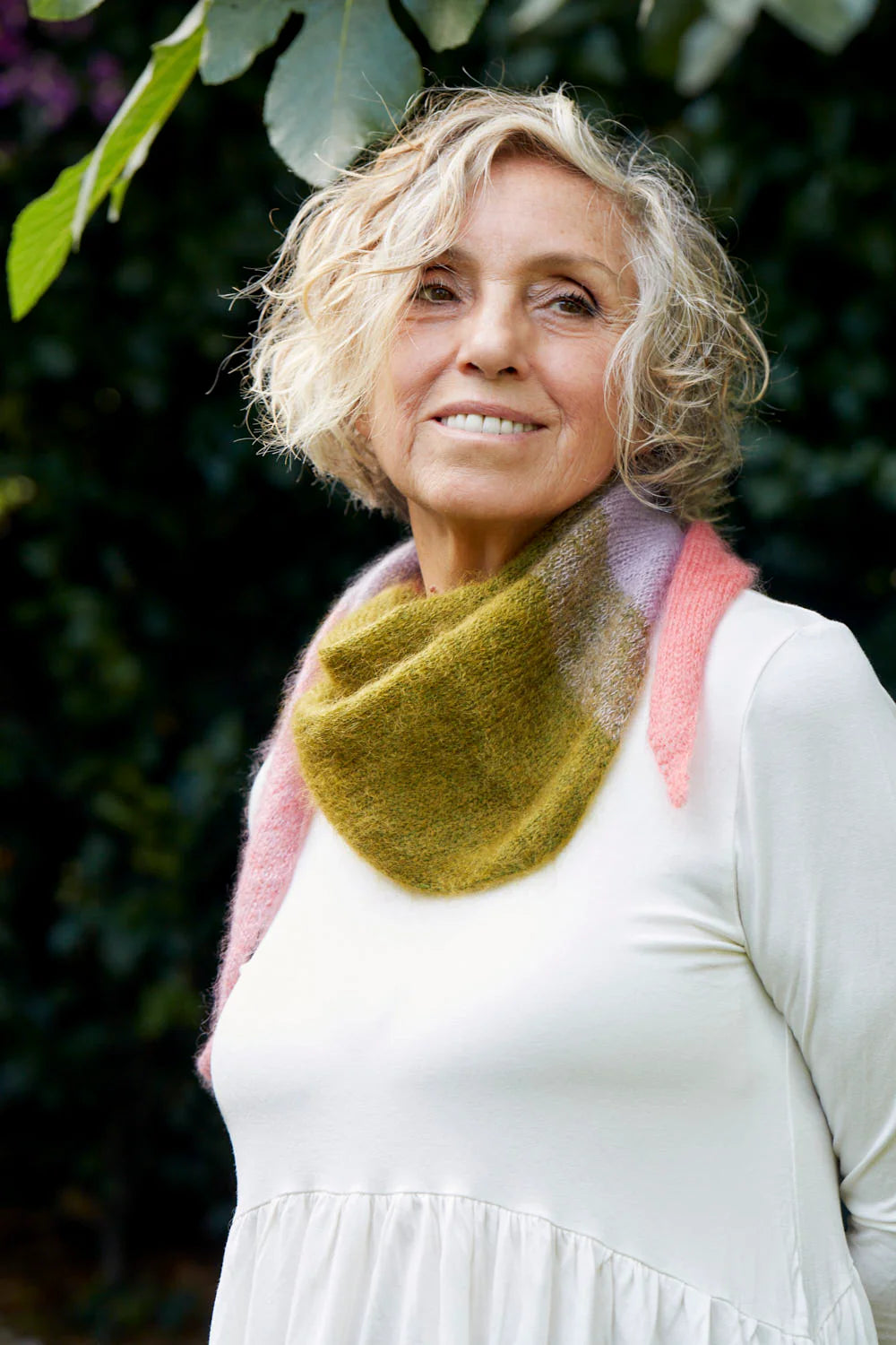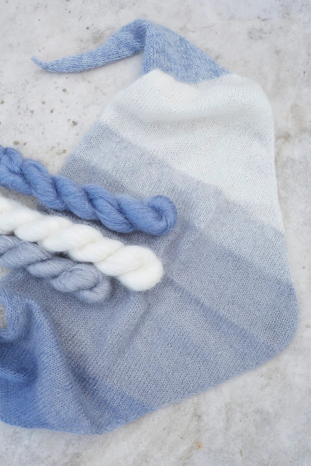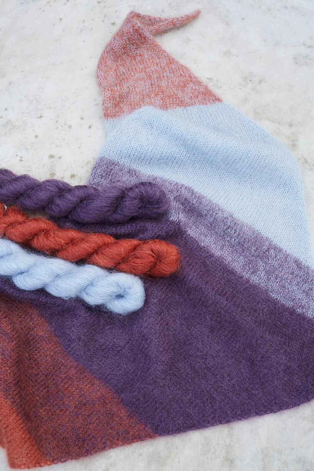 Bon Melange is a delicate, triangular scarf that mixes three colors of silk mohair to create new marled shades in asymmetric color blocks.