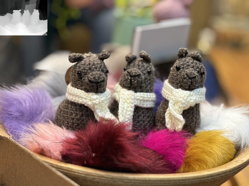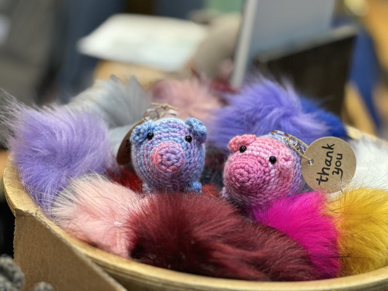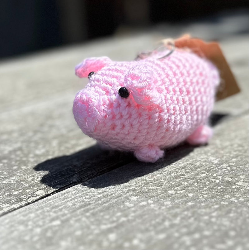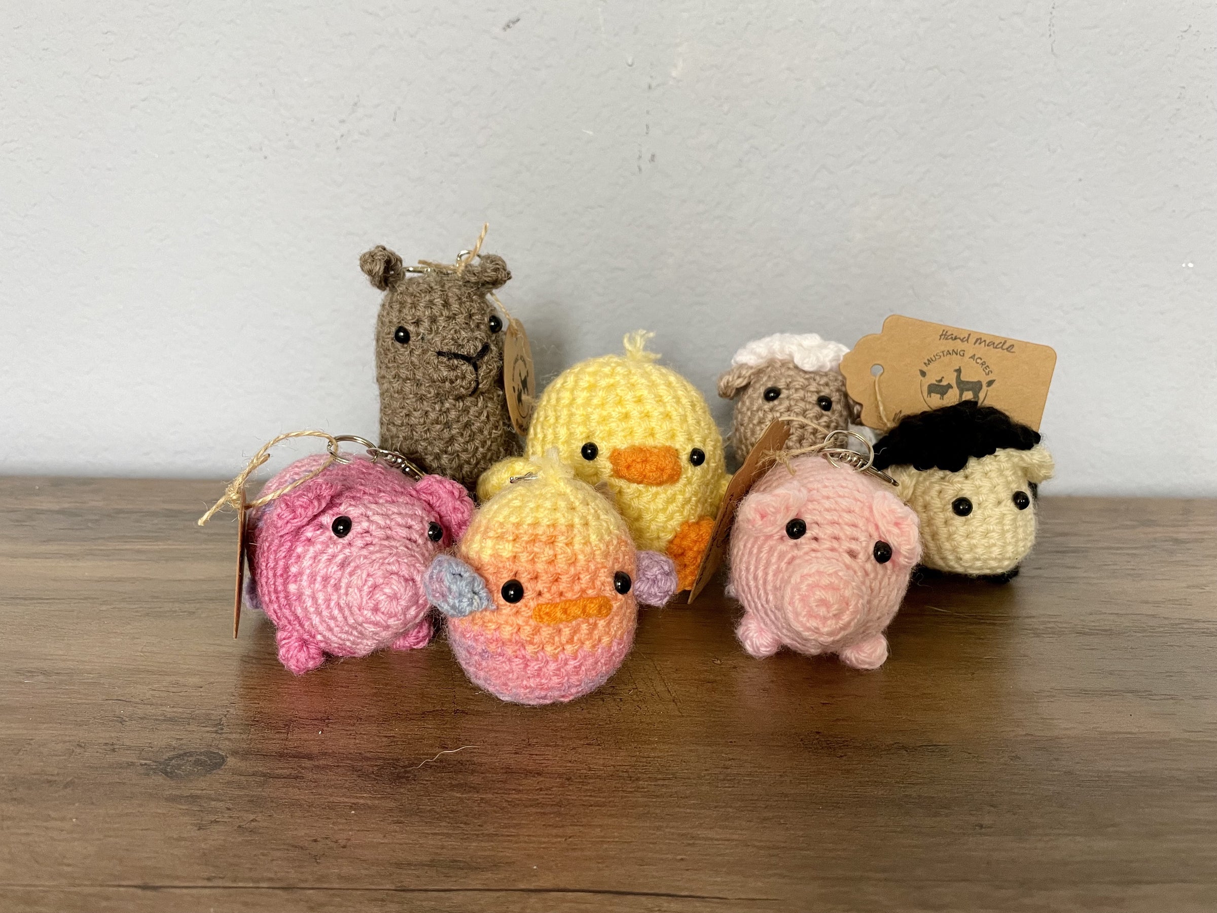 Lovely charming crocheted amigurumi key chains hand made by one of the founders of Mustang Acres. Representing the animals found on the farm.