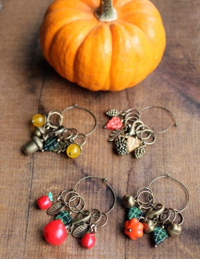 From apples and acorns to pumpkins and pinecones these charming sets perfectly represent the fall season. Our Autumn Harvest stitch markers are made by hand in California with Czech glass beads along with enameled, resin and antique bronze charms. Each set consists of 5 ring stitch markers that fit up to a US10 needle and 1 removable progress keeper.