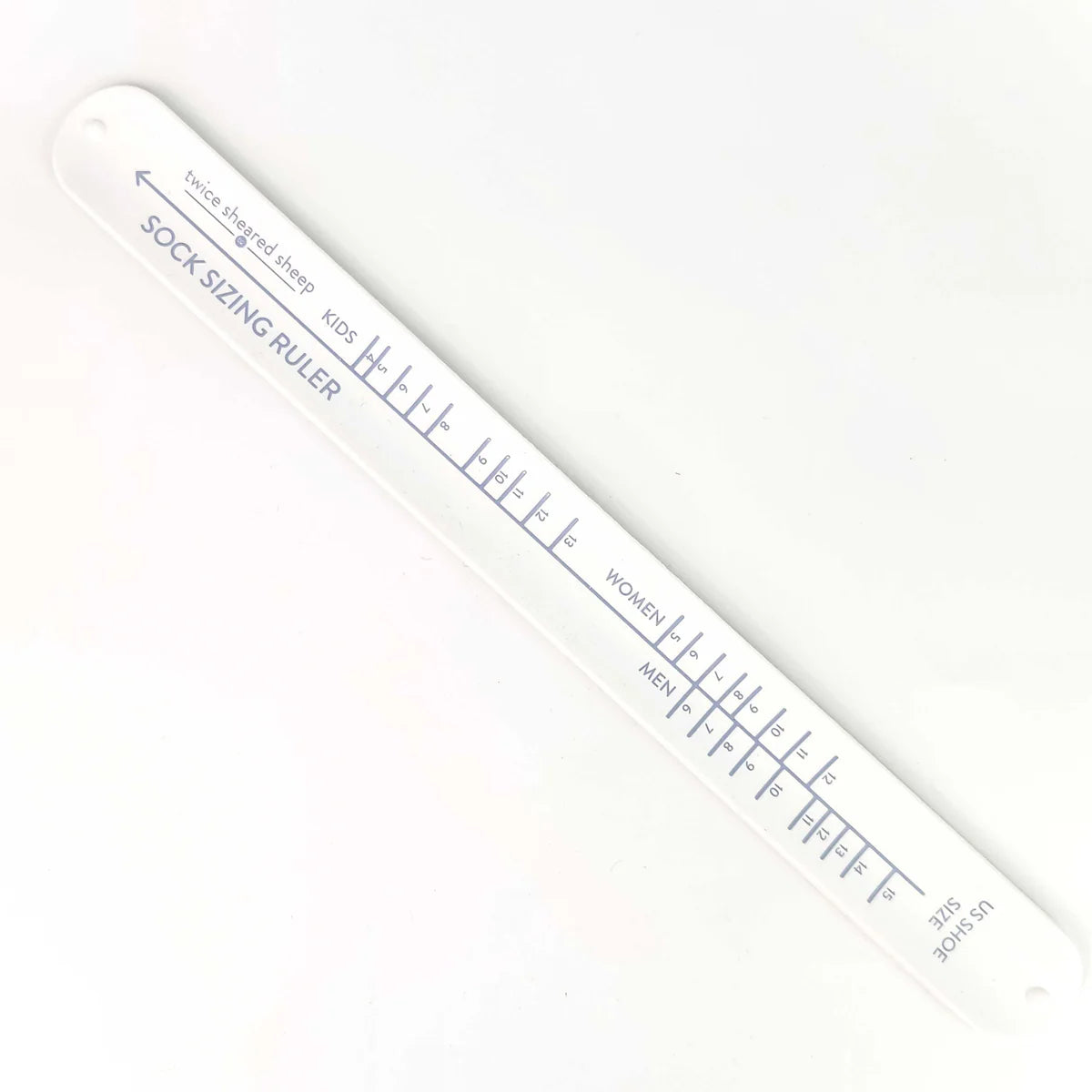 - Place the ruler with the arrow snug into the heel (or toe) of your sock and knit until you reach the line for your desired size